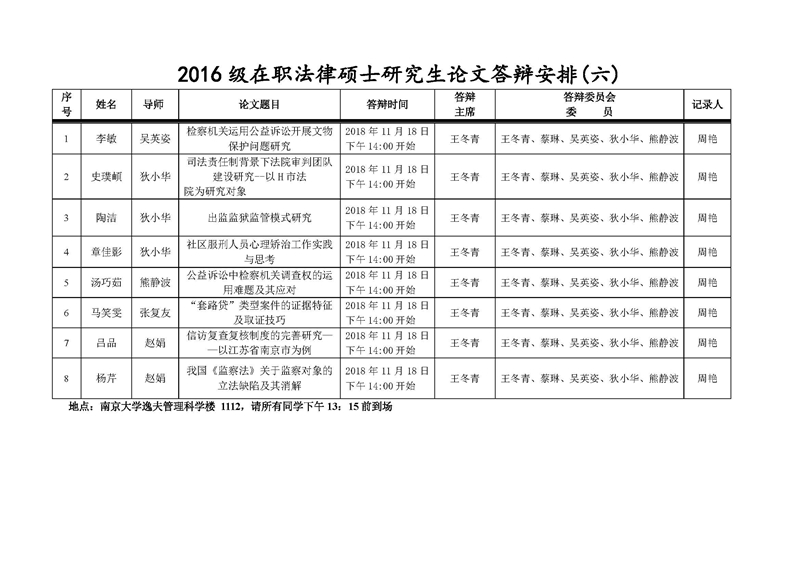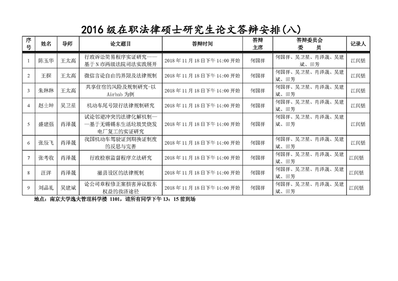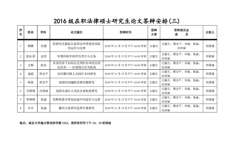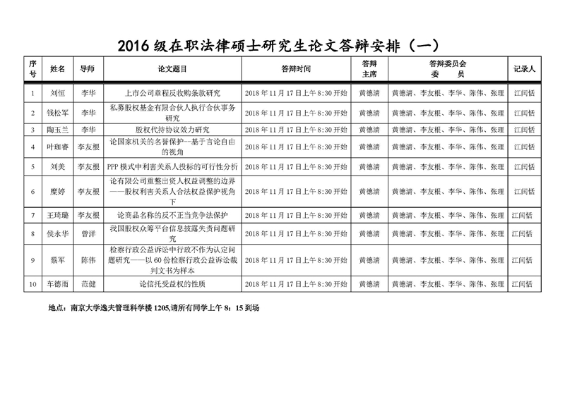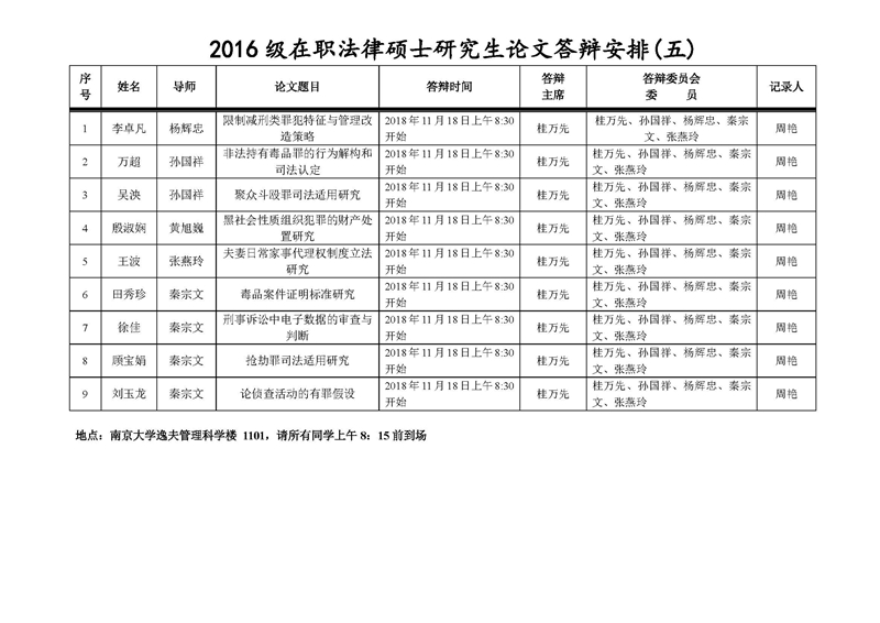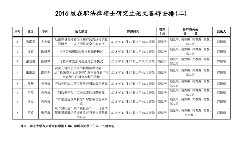 2016级在职法律硕士研究生论文答辩安排