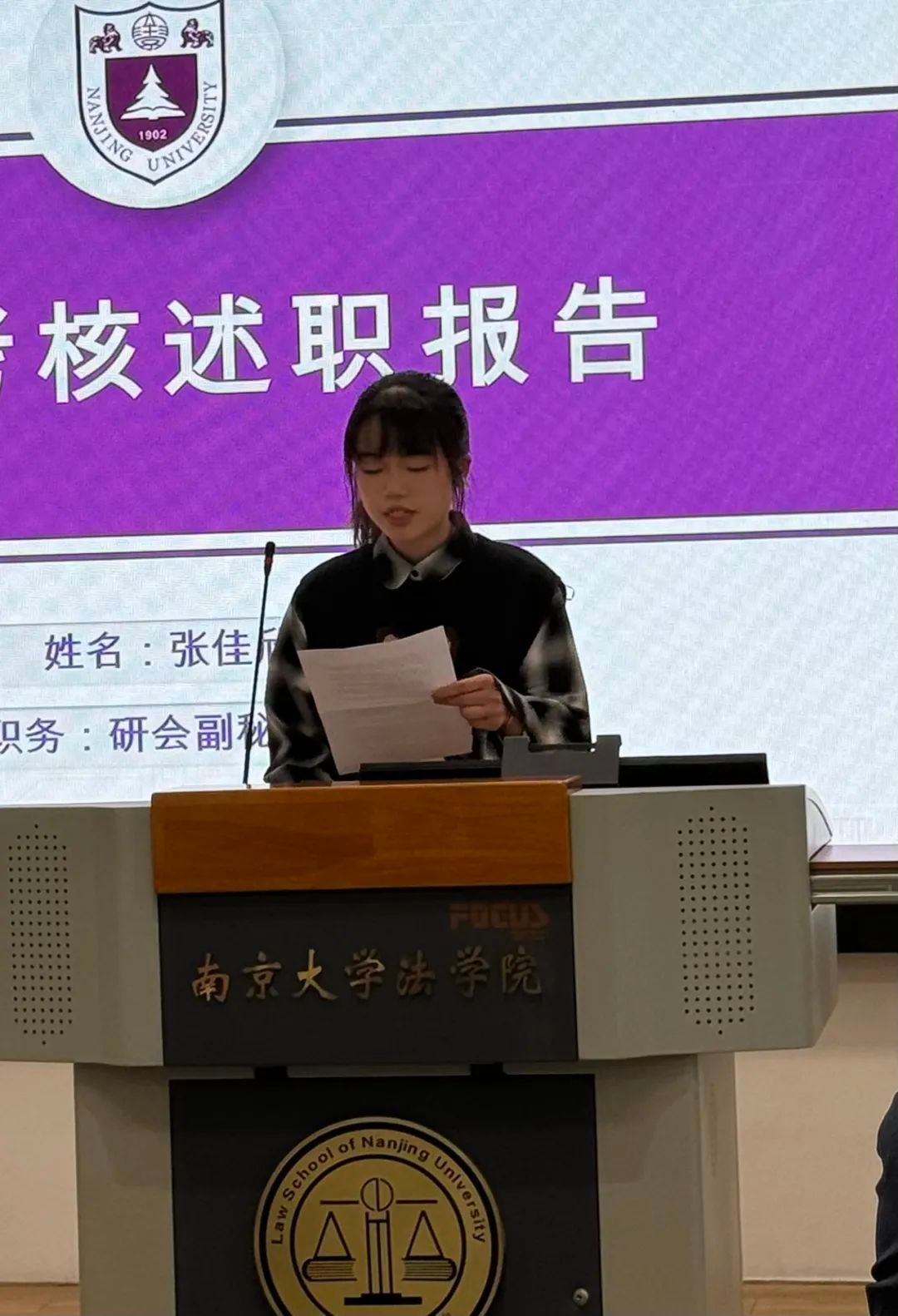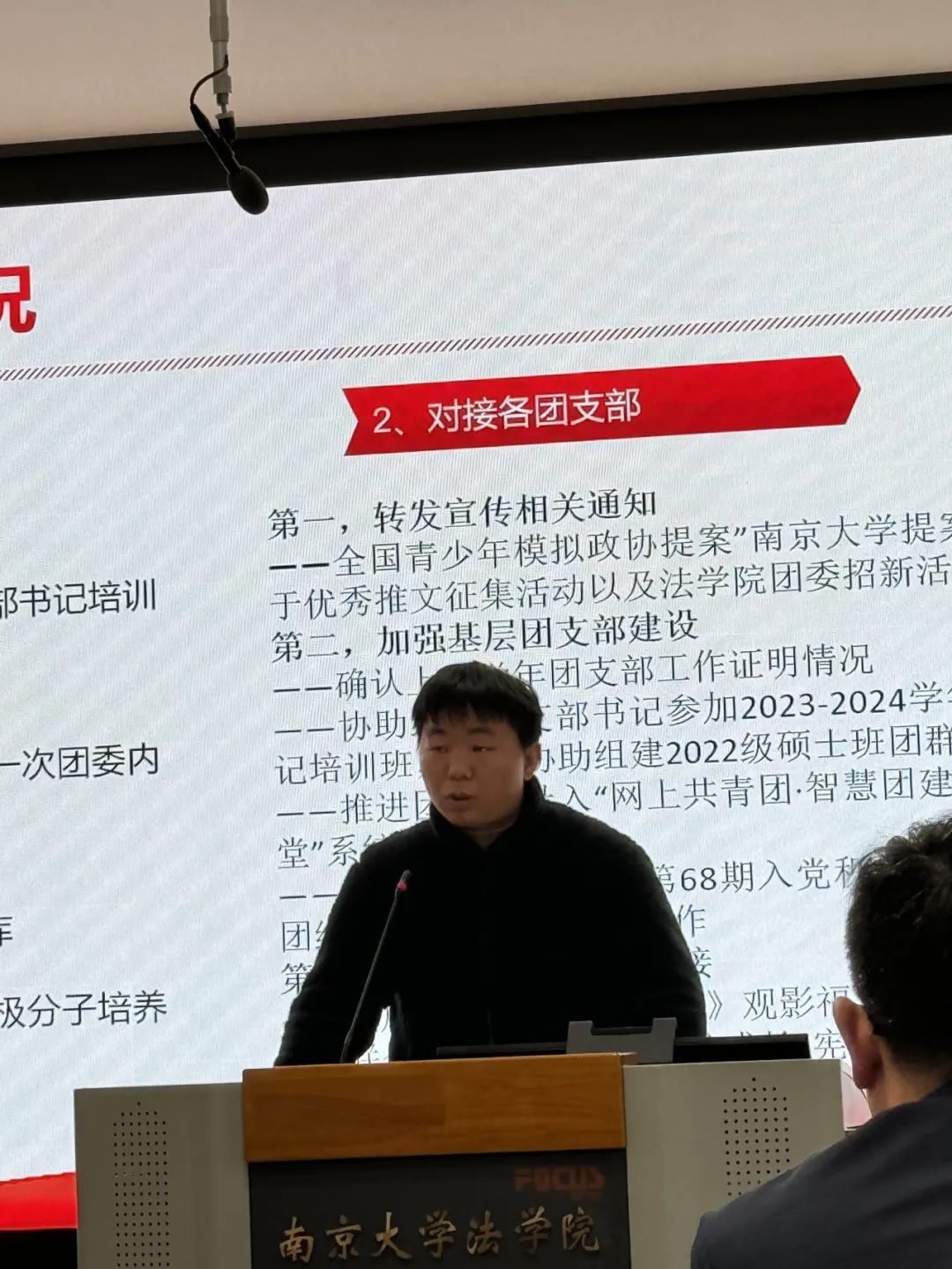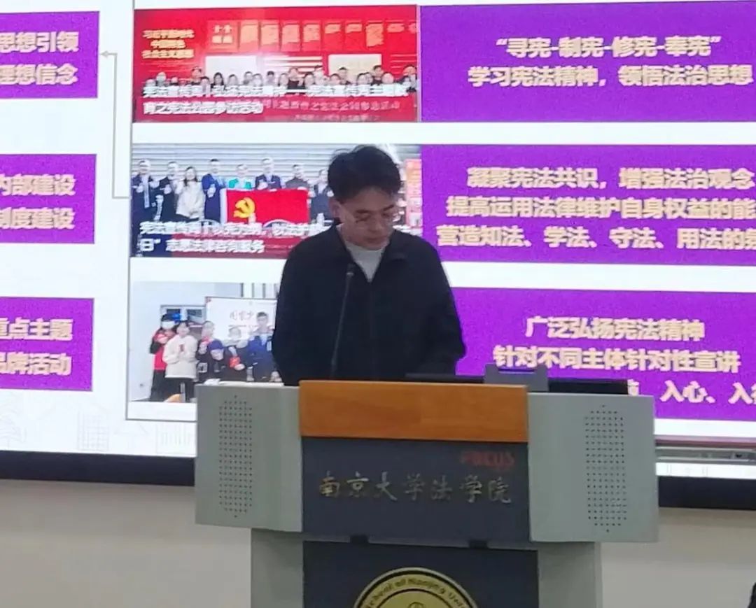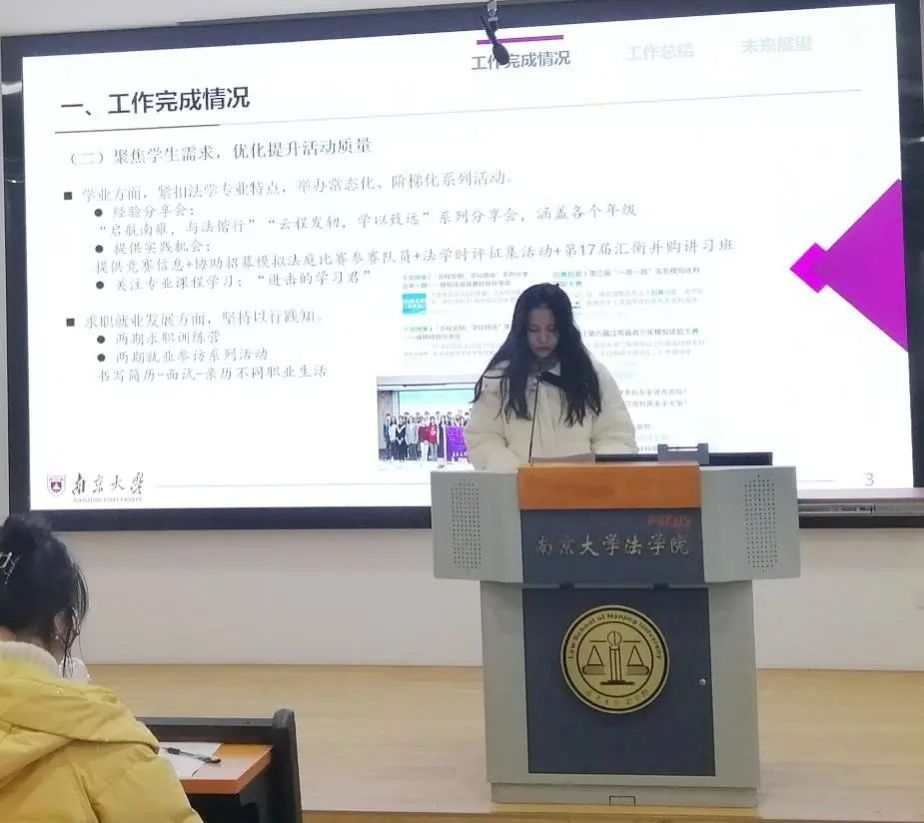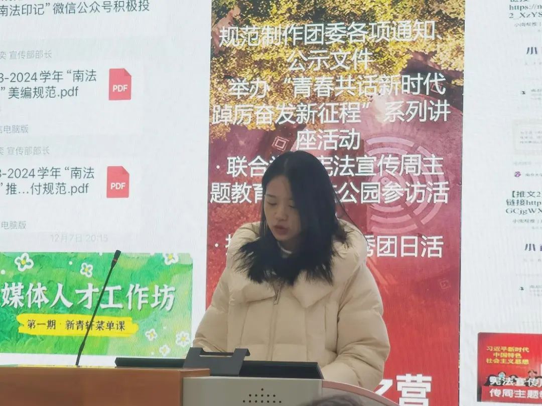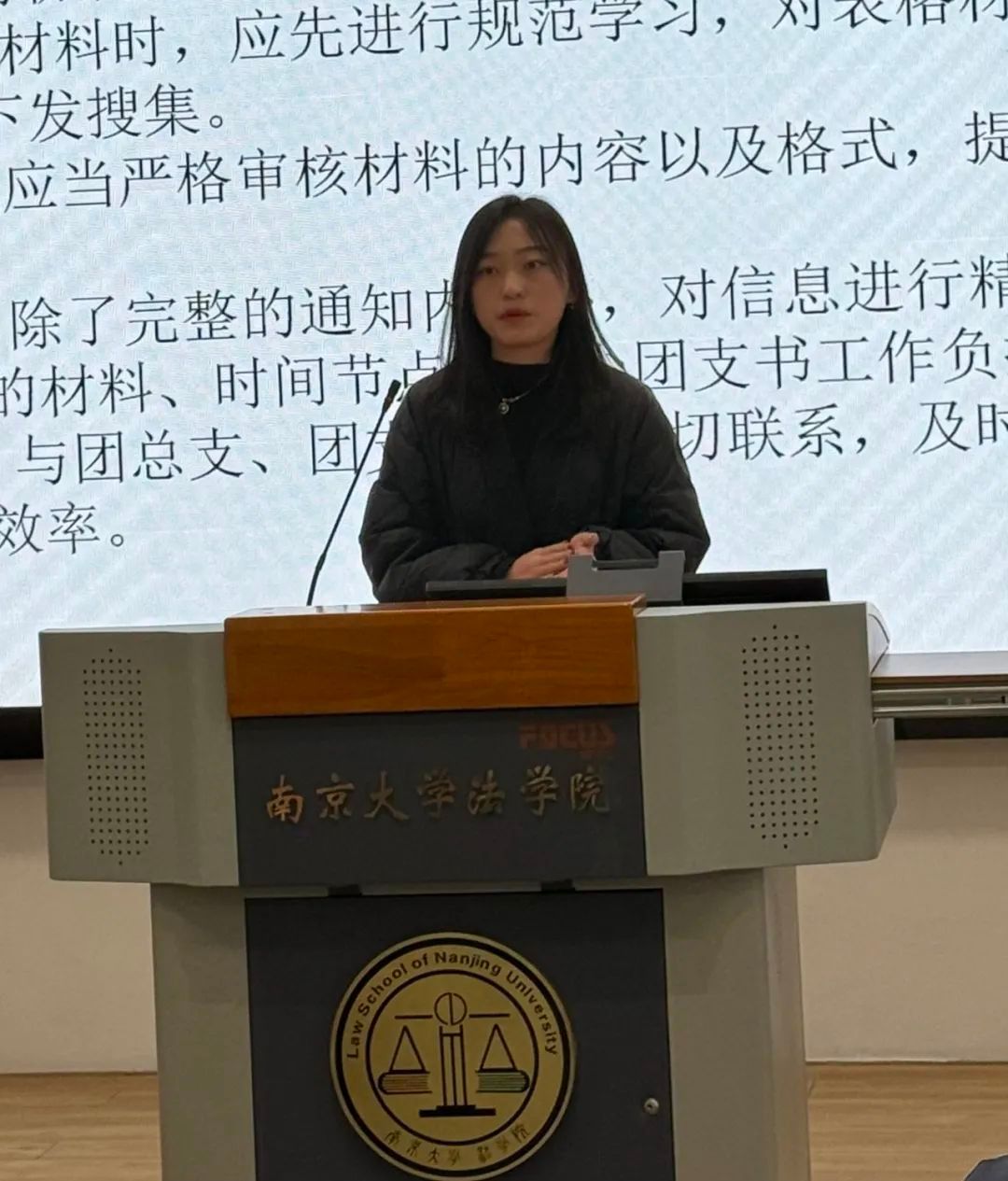 团委(学生)副书记依次介绍分管领域的工作情况。高嘉悦从项目培育、学术创新和基础服务三个角度出发对学创部工作成果进行展示;章岳珲着重介绍了社会实践部和生涯发展部持续以孵化“南法青年为科技强国保驾护航”的社会实践项目为工作导向,坚持探究法学学子在学习实践中如何以专业技能为科技创新保驾护航;赵奕淳聚焦思想引领、内部建设、重点主题三个方面,展现了志愿服务部在增强信念、完善制度、打造品牌三个方面获得的成果;朱滢从“坚守组织之门,常亮组织之灯”和“练就宣传之文,驻扎宣传之营”两大主题出发,分别对组织部和宣传部的工作成果进行汇报。