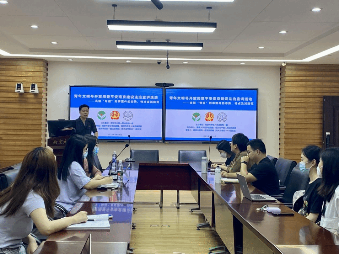研究生团总支、2021级法学硕士团支部共同承办。南京市中级人民法院刑一庭法官、南大校友周晓作为主讲人,针对案件办理过程中遇到的高校学生犯罪类型进行法治宣讲,重点分享了当前“帮信”刑事案件的形态、特点及其防范对策。市法院刑一庭法官助理刘婷婷、2021级法学硕士团支部学生参与了活动。