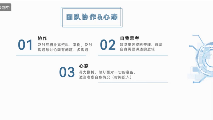 ps.评委可以随时打断、询问问题,评委询问时间不计入陈述时间,选手回答时间计入(未贯彻),要注重评委问题的回答。