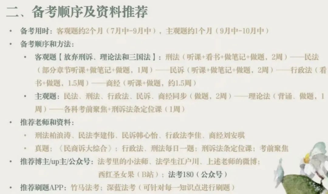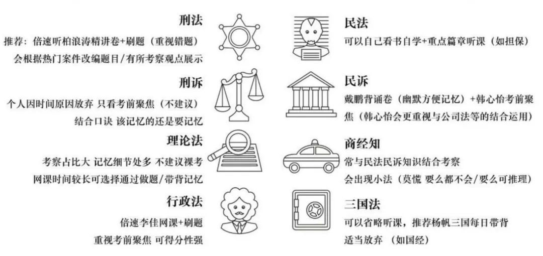 (2)建议先复习民法、刑法,打好基础,其余科目再根据自身基础灵活安排。