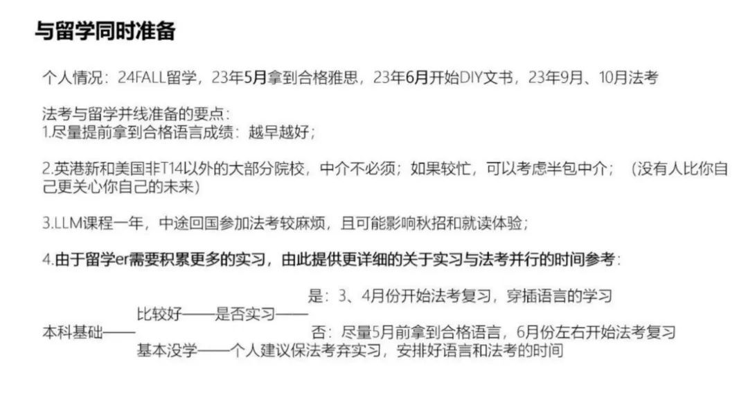 重点介绍与留学同时准备的时间线,强调要尽量提前拿到合格语言成绩,并提供更详细的关于实习与法考并行的时间参考。