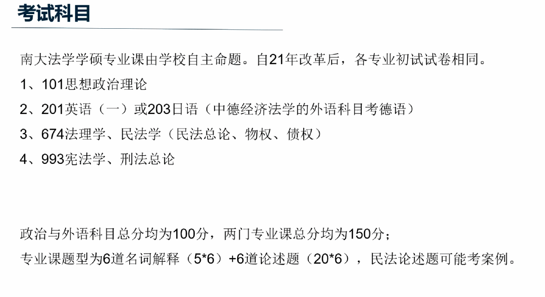 南大法学学硕专业课由学校自主命题,在2021年考试改革后,不同专业的初试考试科目相同。初试分为四科,思想政治理论、英语(一)或日语(中德经济法学的外语科目为德语)、专业课一(法理学、民法学)、专业课二(宪法学、刑法学)。其中专业课(一)的难度高于专业课(二),同时需要注意的是伊莉影片