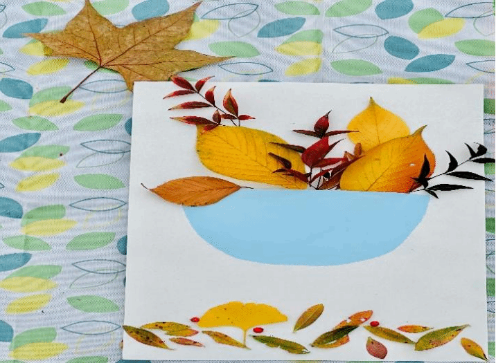 图二:一个优雅的落叶花篮只需要纸张和落叶,将五彩斑斓的落叶粘贴于纸张上,即可制成。快把冬季的乐趣装进来!