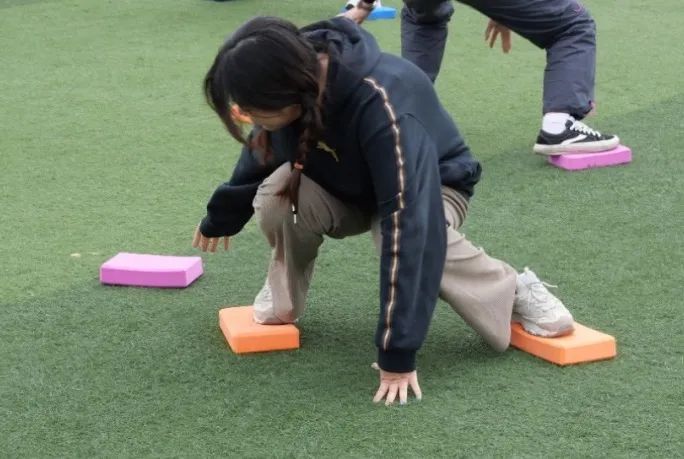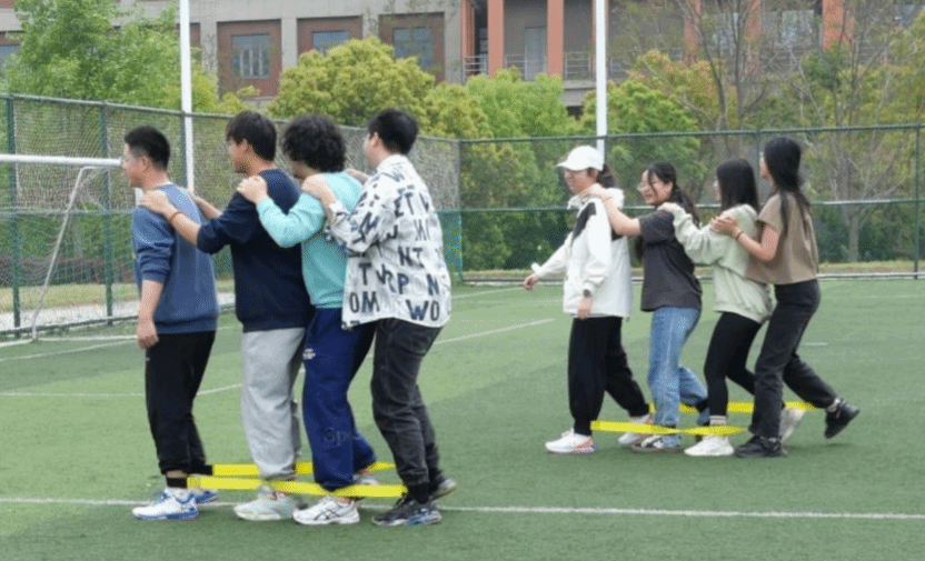 每个小组组员将绑腿带系在腿上,手搭在前面队友的肩上,共同快步跑到终点。这个项目考验的是同学们的团结协作精神。同学们喊着口号,同时迈步向前,一个人出错,就会导致整支队伍落后甚至摔倒。通过这个项目,相信同学们一定对“合作共赢”会有更深刻的认知并在未来践行这一理念。