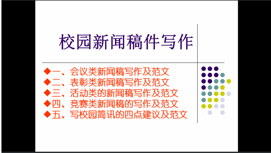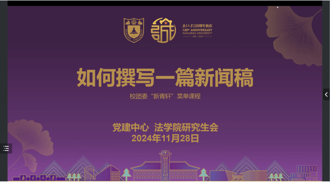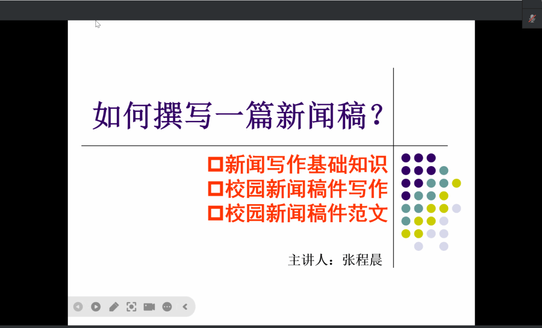 学生党建中心与研究生会开展“新青轩菜单课”培训,校团委“新青轩菜单课”项目组张程晨讲师在线分享“如何撰写一篇新闻稿”。伊莉影片