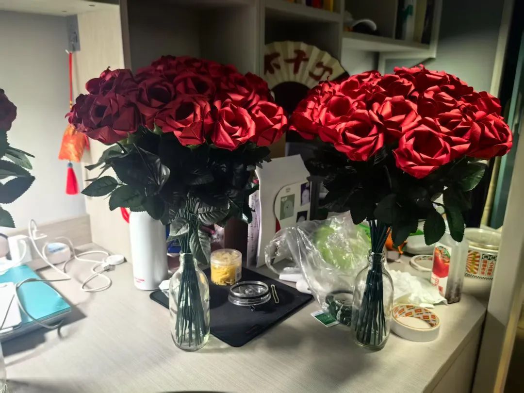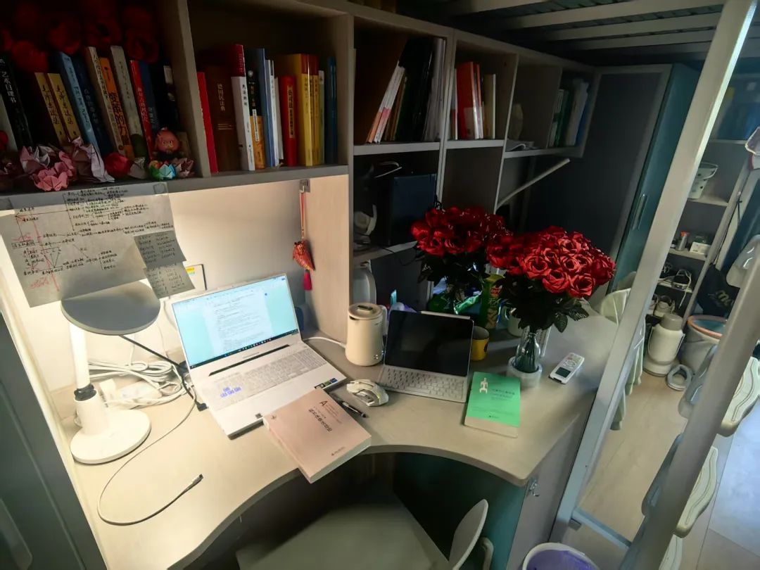 走进4B604寝室,一方鲜艳醒目的红玫瑰瞬间成为视觉焦点,也精准诠释了该寝室的独特格调与文化内核。这幅由寝室成员亲手制作的精美作品不仅展现了巧妙的匠心与浓厚的传统文化气息,更成为凝聚室友情感的独特符号。成员们深谙收纳之道,桌面物品规整,书架陈列有致,红色的丝线仿佛点睛之笔,为整洁的空间注入了温暖活力与艺术韵味。