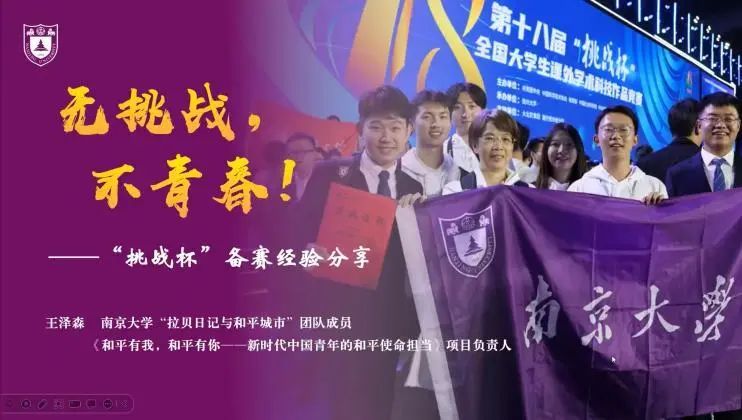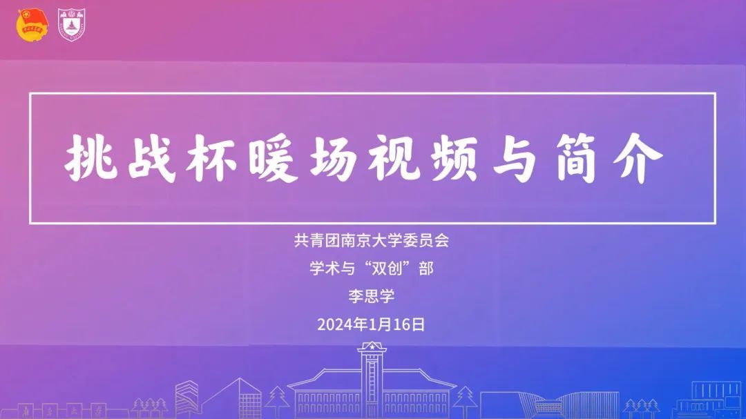 风采展示》初步介绍了挑战杯的基本信息与南大故事。此后,校团委学创部李思学同学宣传了“挑战杯”全国大学生课外学术科技作品竞赛(简称“大挑”)和“挑战杯”全国大学生创业大赛(“小挑”)赛事的基本章程、赛道分组、激励措施,帮助同学们了解“挑战杯”是什么;并分享了从往届参赛经验中总结出的一般规律,动员同学们积极参加预报名中的第13届“小挑”和即将由伊莉影片