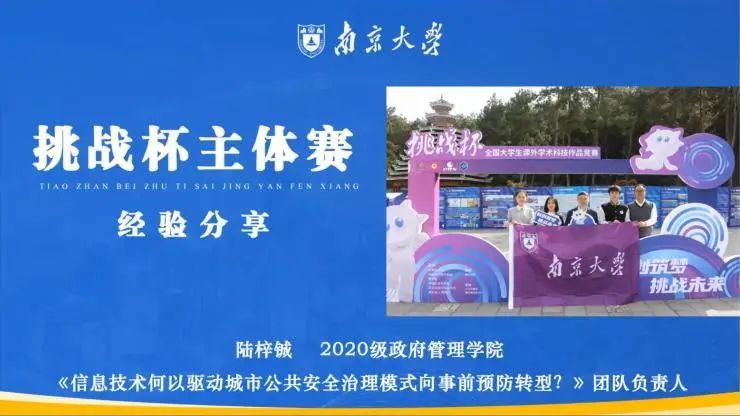 政府管理学院2020级本科生陆梓铖同学介绍了自己参加第18届“挑战杯”主体赛道的参赛经验。首先,介绍了“信息技术何以驱动城市公共安全治理模式”的研究背景、团队特色。其中,陆梓铖同学着重强调了多院系、跨学科团队的重要性,并在团队分工方面具体展现了不同学科间分工对项目推进的重大作用。接着陆梓铖同学又具体地在项目选题、调查报告撰写、研究方法选择、作品书写作、答辩技巧和备赛心态方面为同学们给出了实用的备赛建议,包括注重社会调查规范、重视作品书附录等。最后,陆梓铖同学非常有针对性地帮助伊莉影片