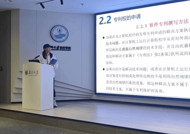 随后,为使同学们更具体地掌握与自己所学专业相关的知识产权保护方法,志愿者从同学们的专业特点出发,选取了“软件产品的专利权保护”和“软件产品的著作权波保护”两个角度展开讲解。志愿者详细介绍了专利权的特点、软件产品中可申请专利权的部分以及专利权的申请流程,让同学们了解了专利权对于保护知识成果的重要性和申请专利的具体流程,为同学们保护自己的知识成果提供了切实可行的指导。