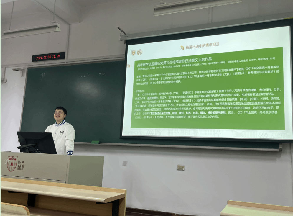 数学系,开展了“法言智汇”之“知识产权进院系(数学系篇)”的活动。在本次活动中,2023级刑法研究生陈金森同学围绕“数学中的知识产权”这一数学系同学感兴趣的法律问题,进行了细致生动的普法宣讲。