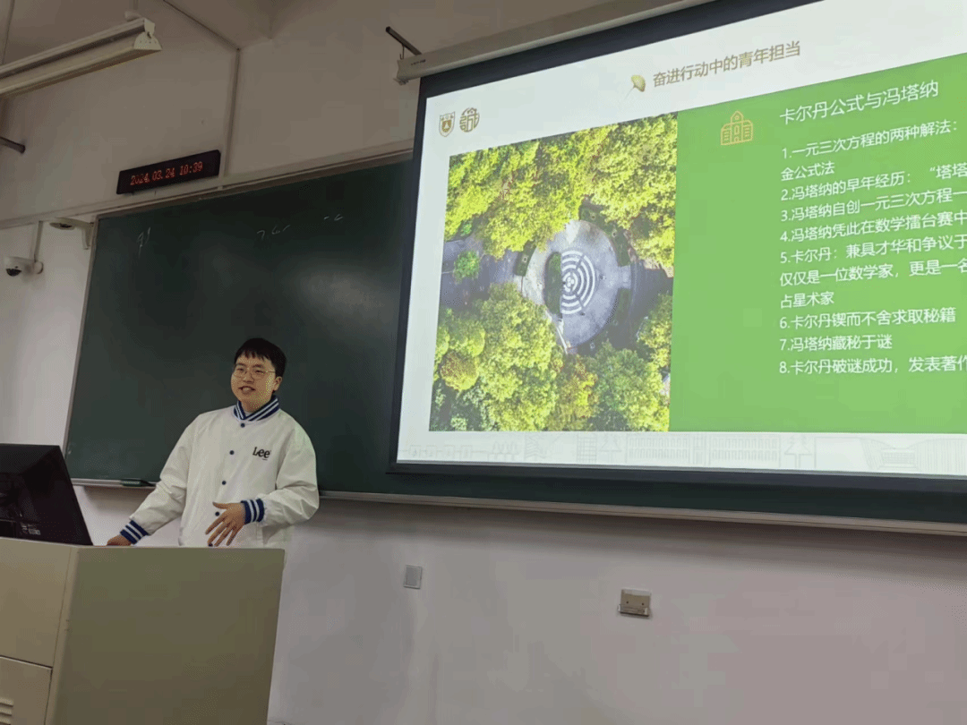 陈金森同学首先为大家介绍了有关卡尔丹公式与冯塔纳的小故事,数学家卡尔丹通过破解数学家冯塔纳留下的谜团,推导出了大名鼎鼎的卡尔丹公式,这个与数学紧密结合的故事吸引了同学们的兴趣,也让大家生动形象感受到了数学领域中知识产权无处不在。