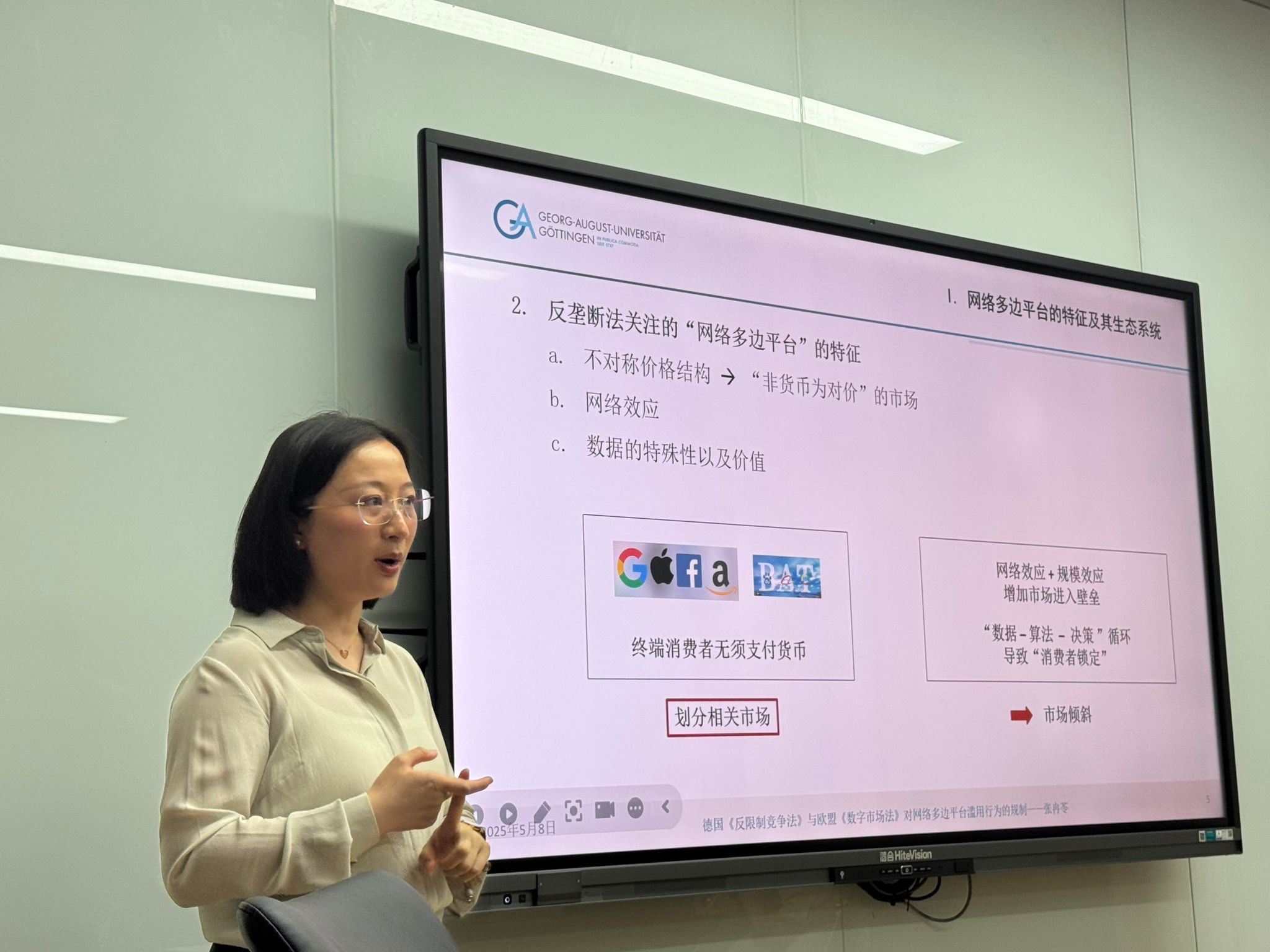 中德法学研究所的邀请,德国哥廷根大学中德法学研究所科研助理张冉苓以《哥廷根大学留学经验分享”和《德国<反限制竞争法>和欧盟<数字市场法>对网络多边平台滥用行为的规制》为题,为第167期“中德法学论坛”做学术讲座。
