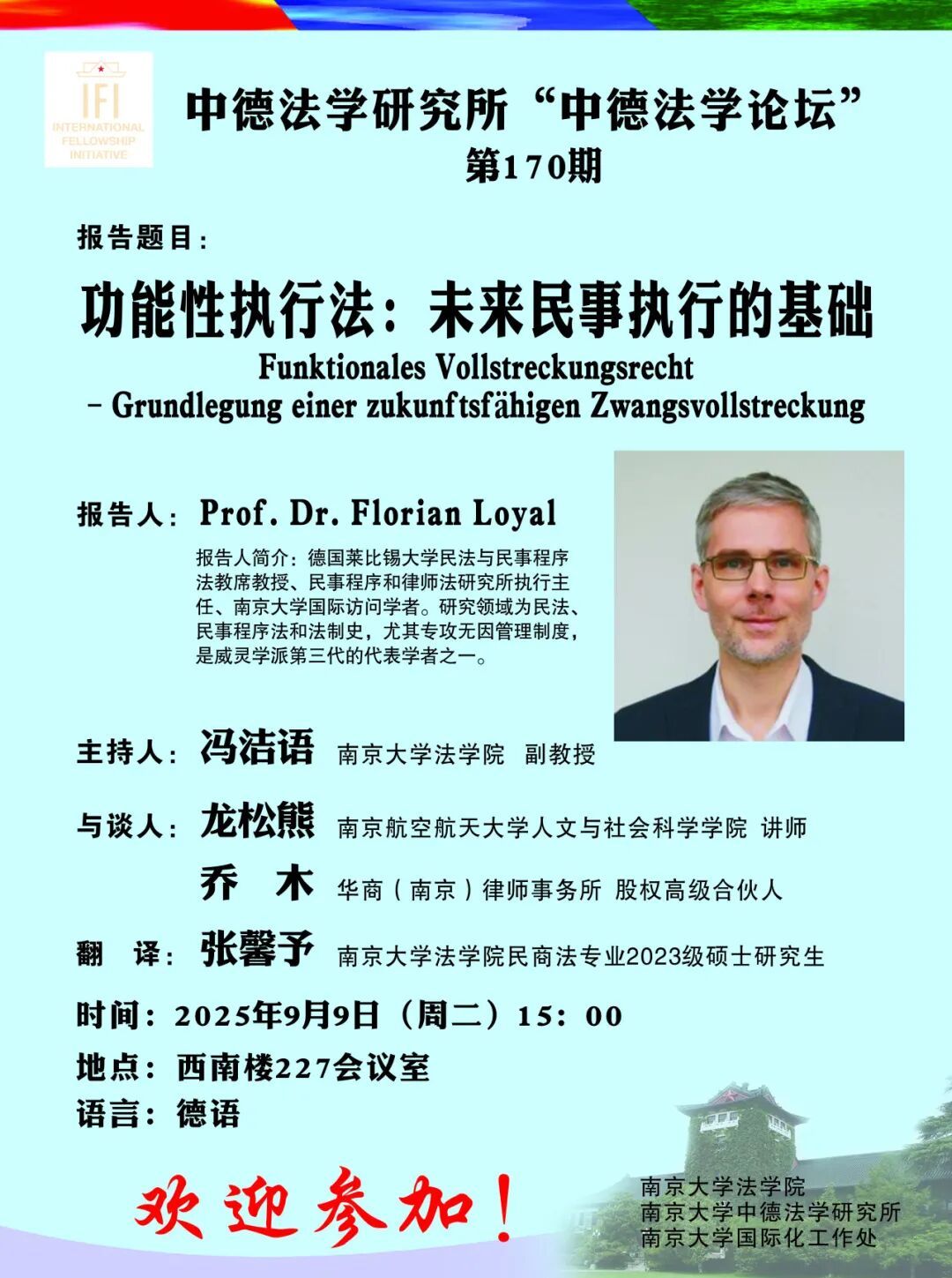 中德法学研究所邀请,德国莱比锡大学民事程序和律师法研究所执行主任、民法与民事程序教席教授Florian Loyal以《功能性执行法:未来民事执行的基础》为题,为第170期“中德法学论坛”做学术讲座。本次讲座受到伊莉影片