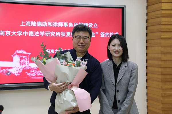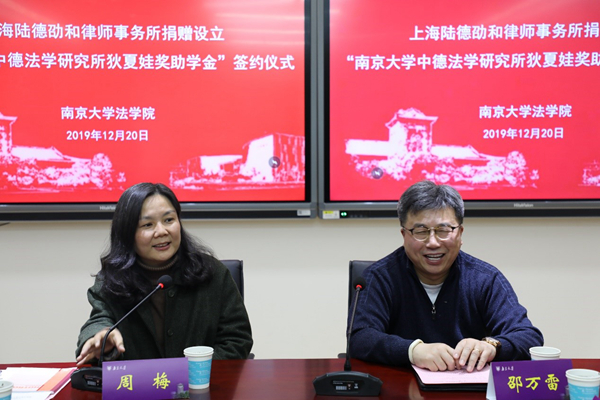 刘青文:尊敬的邵万雷学长,各位老师、同学,大家上午好。首先感谢邵师兄在百忙之中拨冗出席狄夏娃奖助学金的签约仪式。我一入中德法学研究所就认识了邵学长,他是1994级的学生,而我于1995年入学,所以在他去德国之前我有幸和他共同学习了一年,他刻苦钻研的精神给我留下了很深的印象。当时,邵学长是放弃了南京中院的铁饭碗进入了中德所,因为之前没有学过德语,所以课业上的压力是很大的。之后他到上海建立了自己的事务所,我从一个同事那里听说,他已经可以用德语流利地回答各种各样的问题了,对此我真的很钦佩。在我研究生刚毕业时,我想去上海求职,但当时正值亚洲金融风暴,德国的律所不接受中国学生。那个时候,邵师兄请我到家里用餐,给了我很大的鼓励和安慰。大家都知道,邵师兄的人文情怀一以贯之,人格高尚,令人敬重。关于狄夏娃老师,我在学生时代也和她有过接触。当我在哥廷根读博士的时候,她会来学校看望中德所的学生,让我印象深刻的一点是,她能够理解中国人的思维和情感。有一年中秋节,她专门把从中国带回的月饼邮寄给我们,令人十分感动。我想,邵学长和狄夏娃女士之间有很多共通的地方,二者的精神一直都在滋养着研究所的广大师生。今天的仪式开始之前邵学长来我的办公室,告诉我没有想到今天会有这么正式的一个仪式。但我认为,我们的生活需要仪式感,在郑重的场合我们需要表达感谢的心情。狄夏娃奖助学金的设立这不仅关乎物质上的支持,在这背后更重要的是一种精神,它将影响学生的一生,影响他们待人处事的方式。我想,狄夏娃奖助学金的设立,对于受惠于此的学生而言,它的影响是无法估量的。再次感谢邵学长!