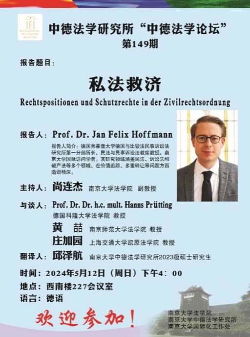 中德法学研究所邀请,来自德国弗莱堡大学的Jan Felix Hoffmann教授为第149期“中德法学论坛”做了题为“私法救济”的学术讲座。