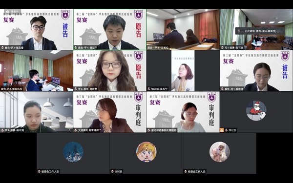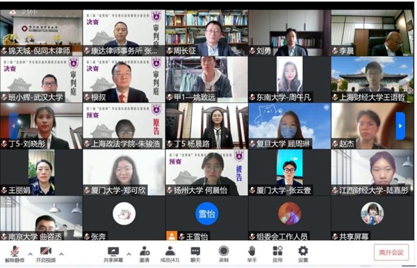 为响应疫情管控措施,本届大赛的复赛、半决赛也均于线上举办。2022年4月16日,第三届“金陵杯”复赛于线上腾讯会议进行,获胜的4支队伍于4月17日上午进行线上半决赛。最终,2支获胜队伍凭借扎实的法律基础、沉着的临场表现和出色的法庭辩论技巧,顺利晋级决赛。