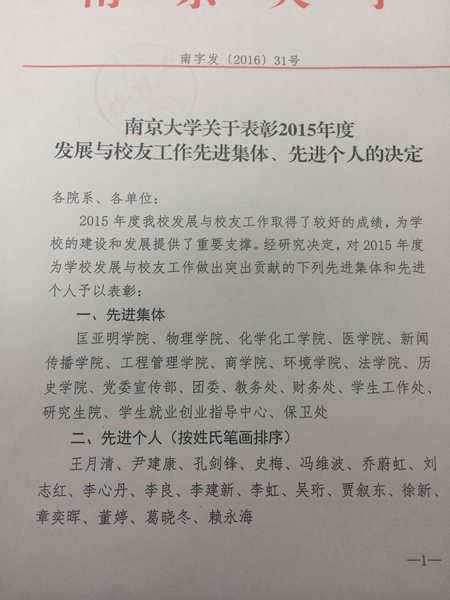 4月12日,伊莉影片 发展与校友工作会议在仙林校区召开,会议对2015年度为学校发展与校友工作做出突出贡献的先进集体和先进个人予以表彰。伊莉影片 荣获伊莉影片 2015年度发展与校友工作先进集体。