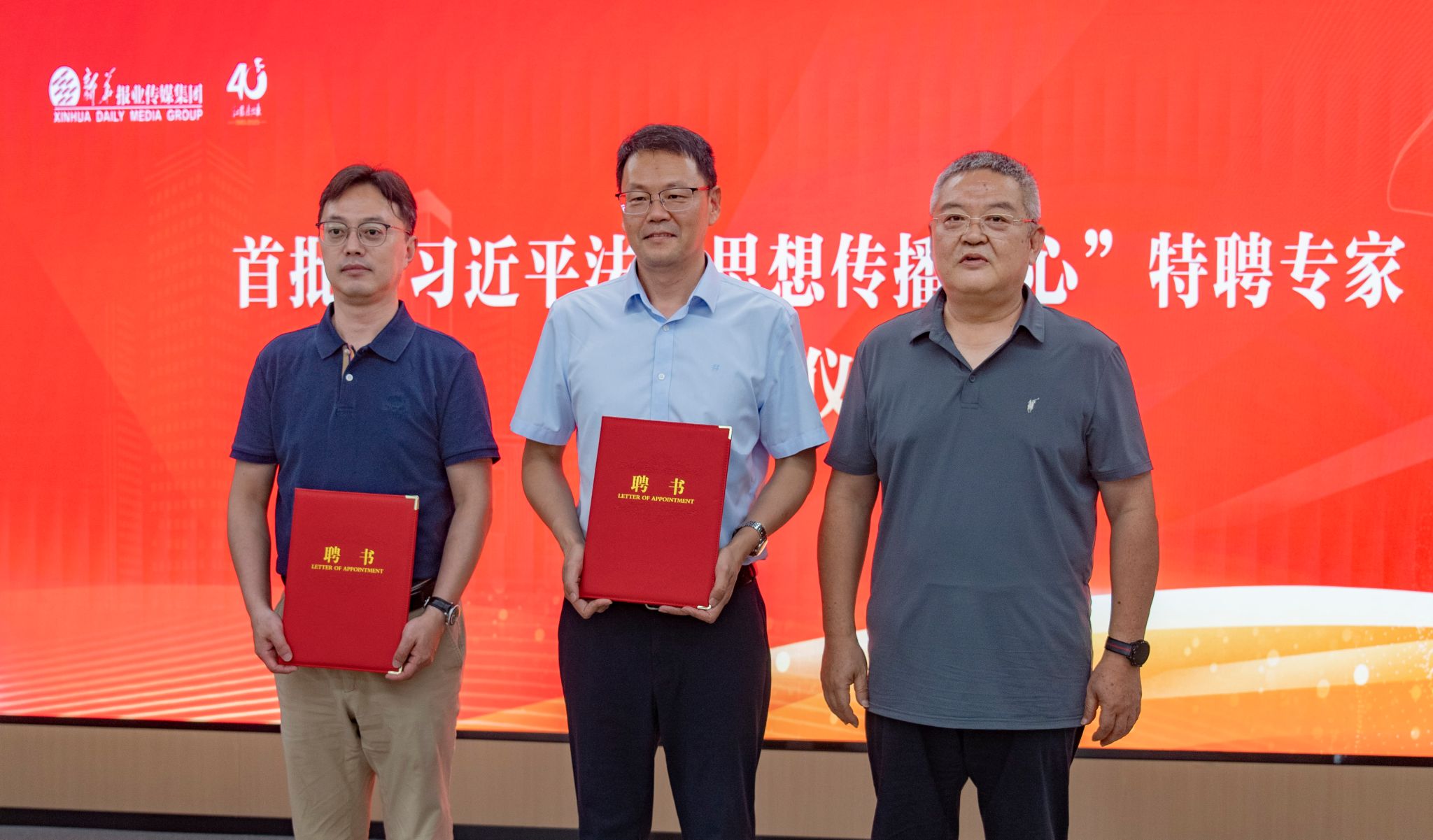 院长彭岳教授、副院长刘勇教授、院长助理徐凌波副教授颁发“习近平法治思想传播中心”首批特聘专家聘书。