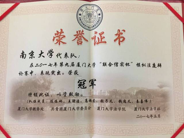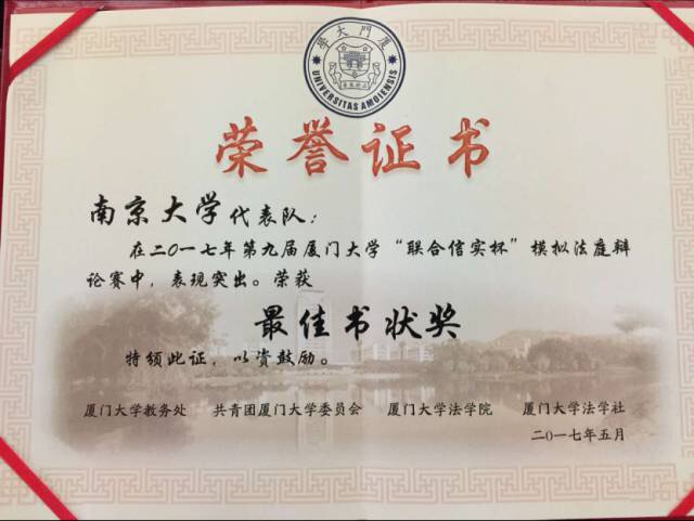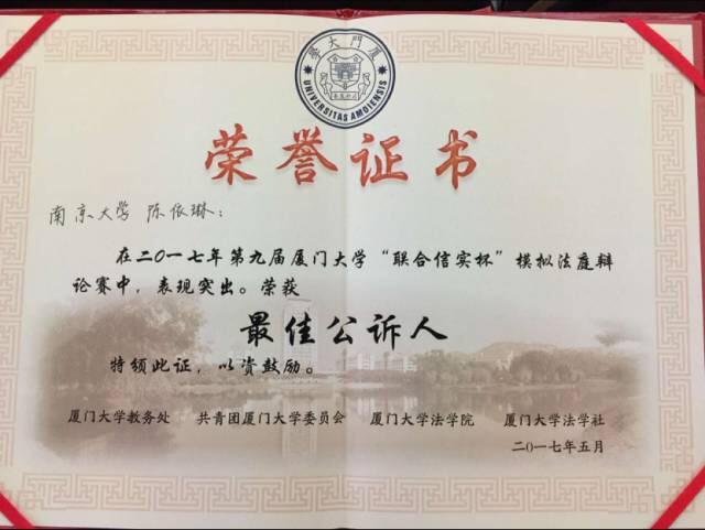 在2017年5月7日举办的第九届厦门大学“联合信实杯”模拟法庭大赛上,伊莉影片 代表队获得了冠军、最佳书状奖。伊莉影片 15级本科生陈依琳同学凭借出色的表现获得了最佳公诉人奖。本次代表队参赛选手由14、15级本科生陈依琳、张子凡、高超星、钱逸凡、秦嘉伟、王珺洁同学组成,充分展现了南大法学学子的风采与才华。祝贺上述获奖同学!