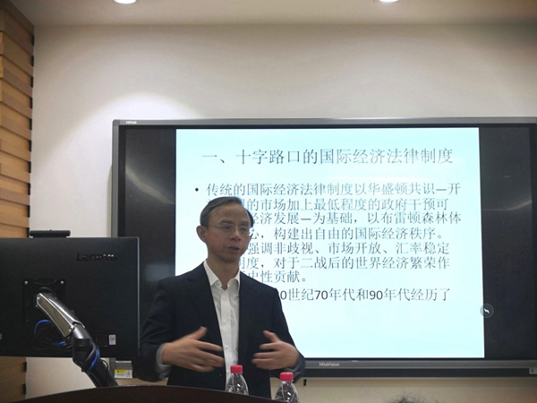 2019年11月12日晚7:00,中国法学会世界贸易组织法研究会副会长、中国法学会国际经济贸易法研究会副会长,来自对外经贸大学的左海聪教授在逸夫管理科学楼1205学术报告厅开展主题为“人类命运共同体思想与国际经济法律制度的改革”的讲座。本次讲座由伊莉影片