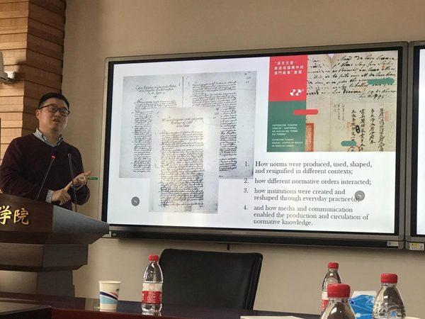 讲座伊始,张仁善教授向在座师生介绍了李富鹏博士的学术经历和德国马普所欧洲法律史研究中心的概况。随后,李富鹏博士开始进行讲座。首先,李富鹏博士主要从空间研究范式的维度阐述法律史学的知识焦虑。在中国,从1904年梁启超发表《论中国成文法编制之沿革得失》、到寺田浩明的“非规则法”与黄宗智的‘非正式性”,中国法律史学科一直沿用着一种“非西方”的空间范式,深陷欧洲中心主义的空间和思维模式当中。中国法律史学的学术研究能否突破和脱离法律的欧洲标准,克服欧洲中心主义?成为现今中国法律史学科应该思考的问题。