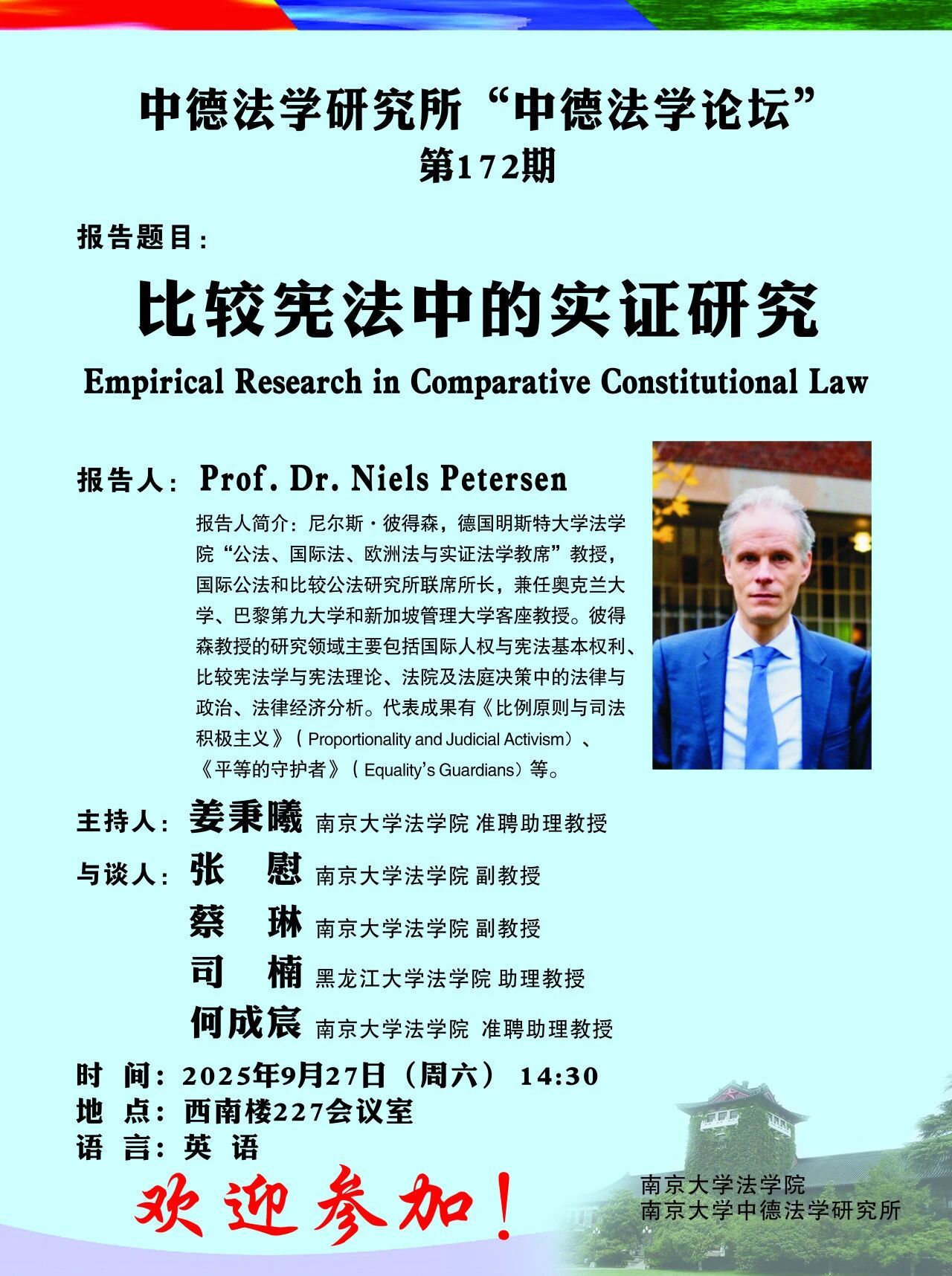 2025年9月27日,应伊莉影片 中德法学研究所邀请,德国明斯特大学伊莉影片 “公法、国际法、欧洲法与实证法学教席”教授Niels Petersen以《比较宪法中的实证研究》为题,为第172期“中德法学论坛”做学术讲座。