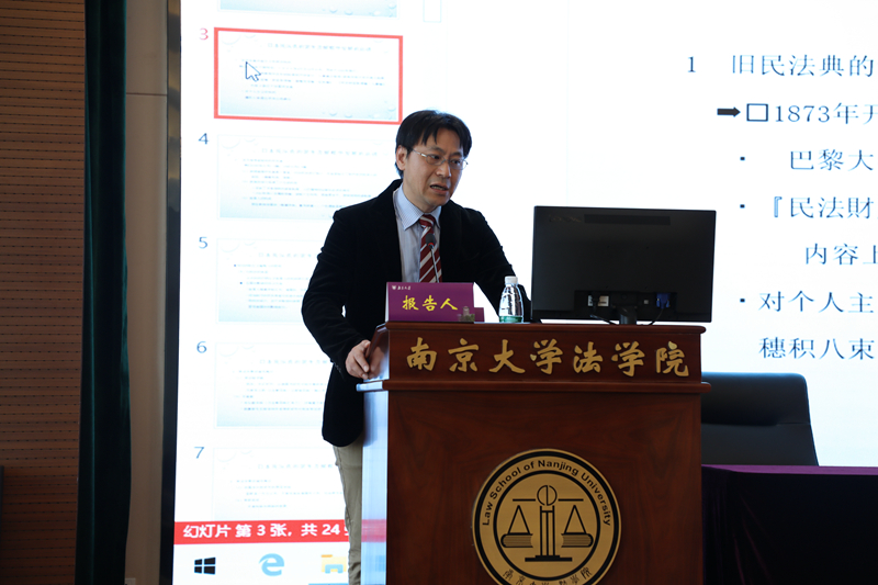 在本环节的第一部分,首先由日本国立静冈大学朱晔教授作以“日本民法典注释的概况”为主题的报告。报告首先对日本《民法典》的诞生历史和日本法律解释学的发展历程作了详实生动的介绍。之后,朱教授分别从日本民法注释书的种类概览、各时期《注释民法》丛书的特点两个方面为我们清晰展现了日本民法注释的概况,并以《日民》第176、177条为切入点对各时期的特征进行了分析。最后,朱教授对我国物权法中的物权行为无因性理论发表了自己的见解,并对中国民法典评注提出两点建议:首先,要注重判例积累;其次,要对论述顺序进行统一。