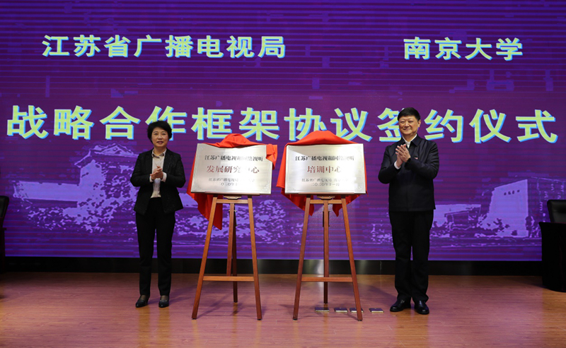 仪式中,胡金波与缪志红共同为江苏广播电视和网络视听发展研究中心、江苏广播电视和网络视听培训中心揭牌。邹亚军与吴以桥代表双方签署战略合作协议。