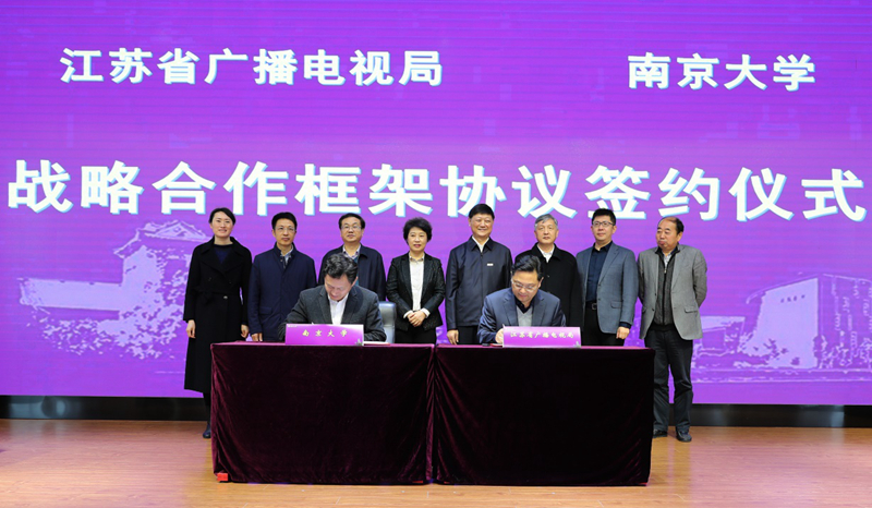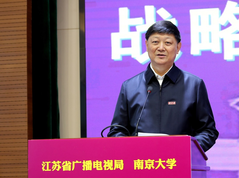 战略合作框架协议签约仪式在我校鼓楼校区举行。双方将在人才交流培养、高端智库打造、精品创作生产、媒体融合发展、基地(园区)建设等方面全方位深化交流合作,加快推动江苏广播电视和网络视听行业高质量创新性发展。校党委书记胡金波,江苏省广播电视局党组书记、局长缪志红出席仪式并致辞。校党委常委、副校长邹亚军,校党委常委、党委办公室主任、组织部长、统战部长王明生,省广播电视局党组成员、副局长吴以桥,省广播电视局党组成员、副局长尹晓平参加仪式。仪式由省广播电视局党组成员、副局长于国民主持。