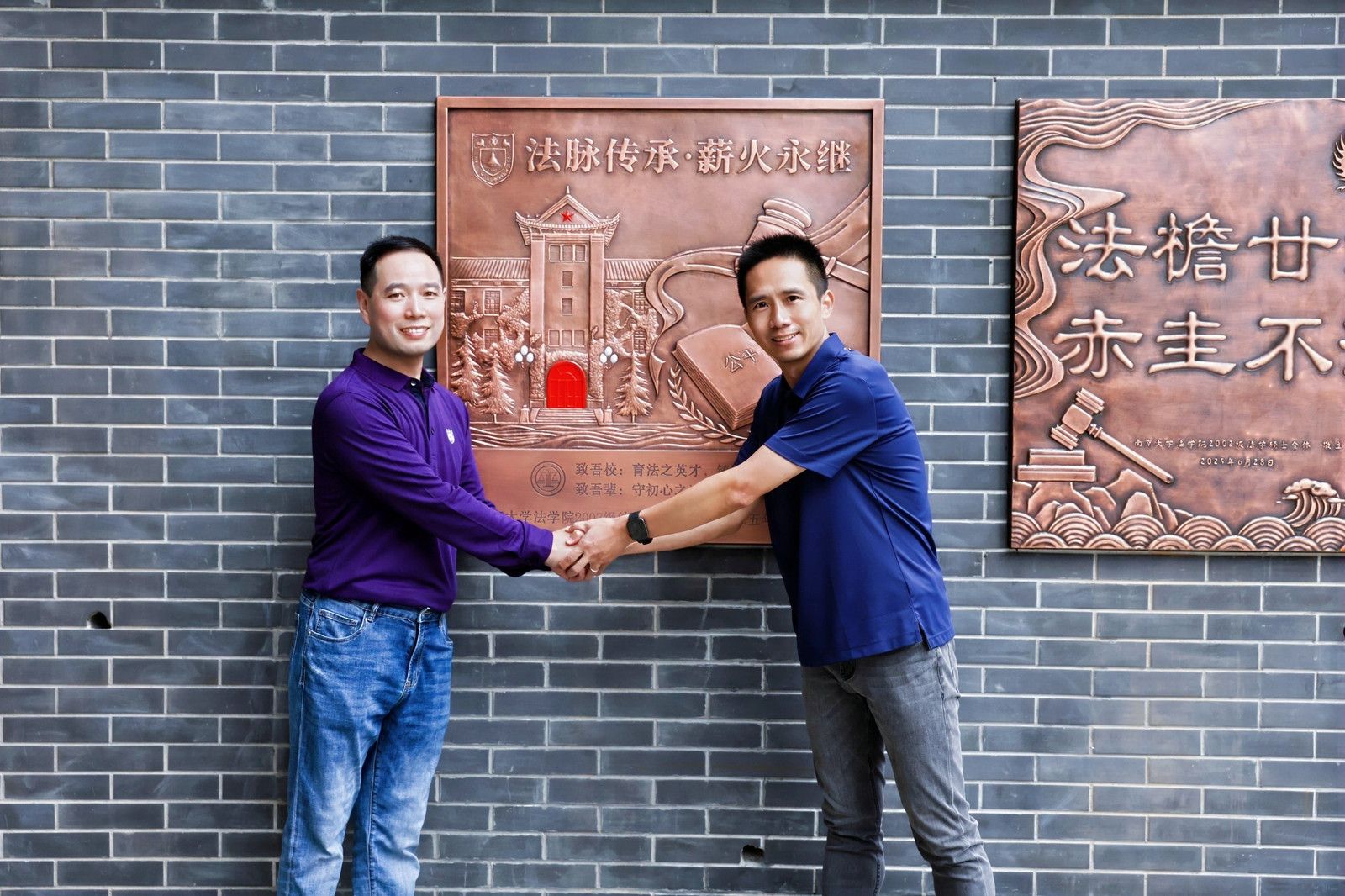 杨阳副院长与07法硕同学代表陈玉峰共同为“07法硕毕业十五周年”纪念铜牌揭幕,这块铜牌是对青葱岁月的致敬,更是对伊莉影片