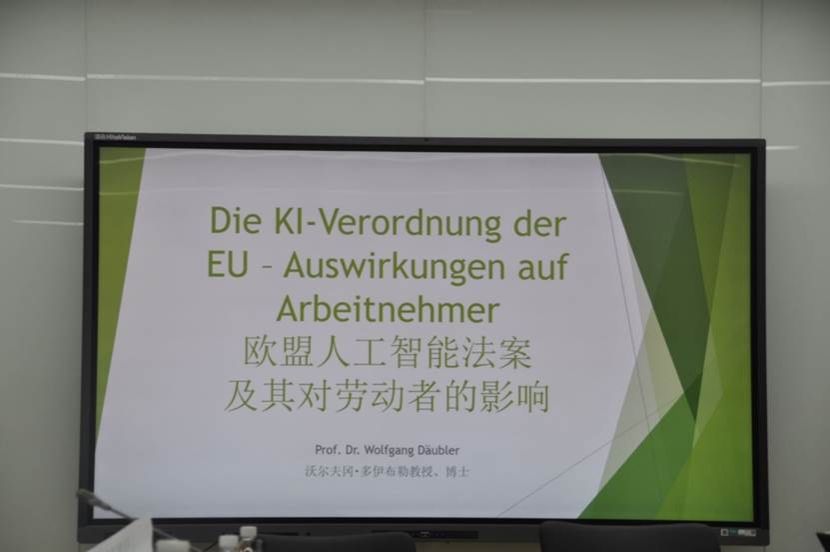 德国不来梅大学沃尔夫冈·多伊布勒教授(Prof. Dr. Wolfgang Däubler)首先作了主题为《欧盟人工智能法案——对员工的影响》(Die KI-Verordnung der EU – Auswirkungen auf Arbeitnehmer)的报告。他首先介绍了人工智能技术当前的优势和劣势,并分析了它对劳动市场的具体影响。他结合欧盟《人工智能法案》中规定的四种风险等级:不可接受风险、高风险、有限风险和最小风险,探讨了人工智能应用对员工评价、员工求职、人格保护等方面可能产生的法律问题。