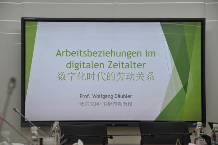 德国不来梅大学沃尔夫冈·多伊布勒教授(Prof. Dr. Wolfgang Däubler)首先作主题为《数字时代的劳动关系》(Arbeitsbeziehungen im digitalen Zeitalter)的报告。报告聚焦数字时代背景下劳动关系的特点,以数字化工具在劳动中的使用为出发点,分析了居家办公作为数字时代普遍运用的工作形式所具有的特征。他认为工时问题在数字时代劳动关系中具有特别重要的地位。此外,他还探讨了工伤保险和第三方责任、居家办公的成本承担等重要问题。